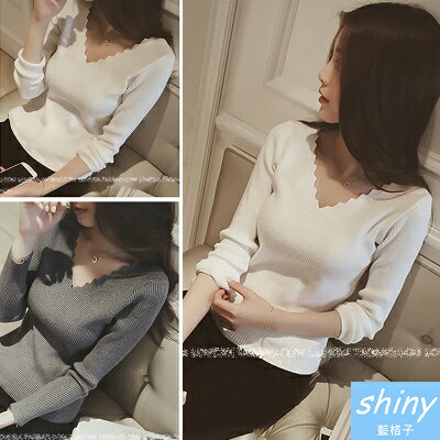 None, ~399超商免運 599折30 輸入代號 M7OJ-IPQJ-ZB18-R5YO【V7414】shiny藍格子-柔美微薰.氣質波浪邊V領修身顯瘦長袖針織上衣。在樂天市場的shiny藍格子有最棒的商品,是您省錢的最佳選擇。